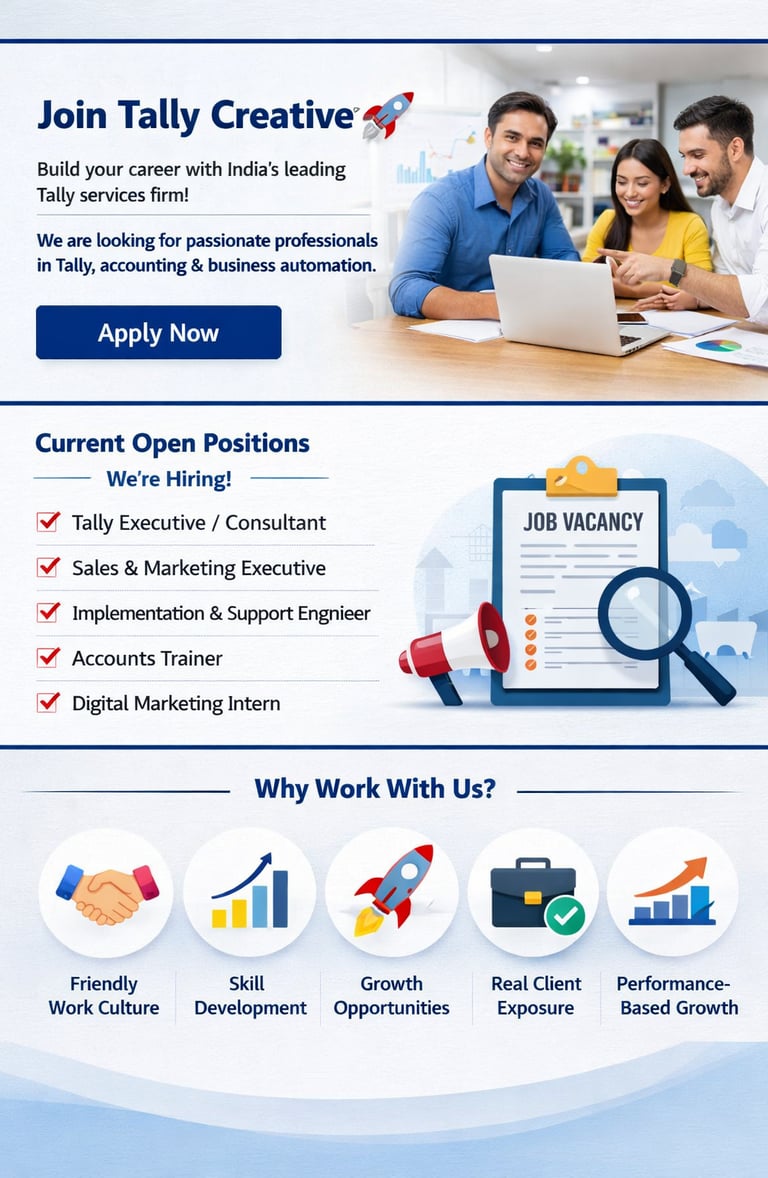 We are growing and looking for talented professionals passionate about Tally software, accounting solutions, and business automation.